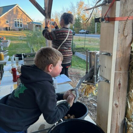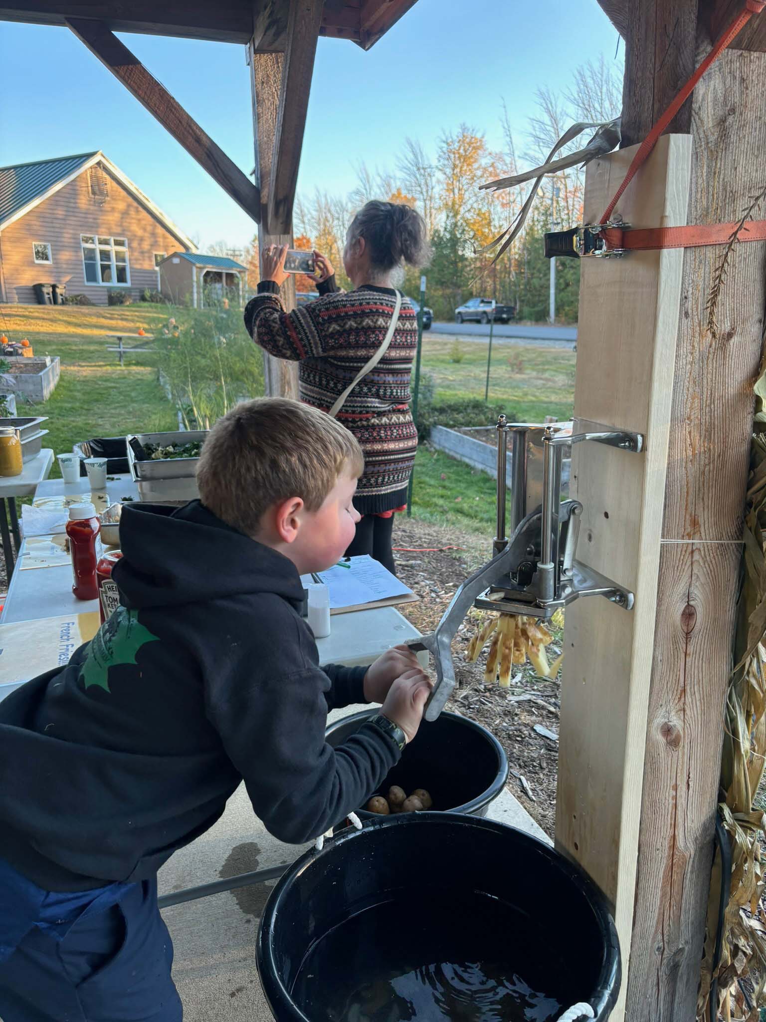 Students harvested and prepared potatoes to make fresh French fries, which were cooked on-site by local masons using a large fryer. With gravy and cheese donated by Crooked Face Creamery, families enjoyed homemade poutine. Students also prepared fresh salsa using garden produce with the help of Master Food Preserver Wendy Kennedy, served alongside chips.